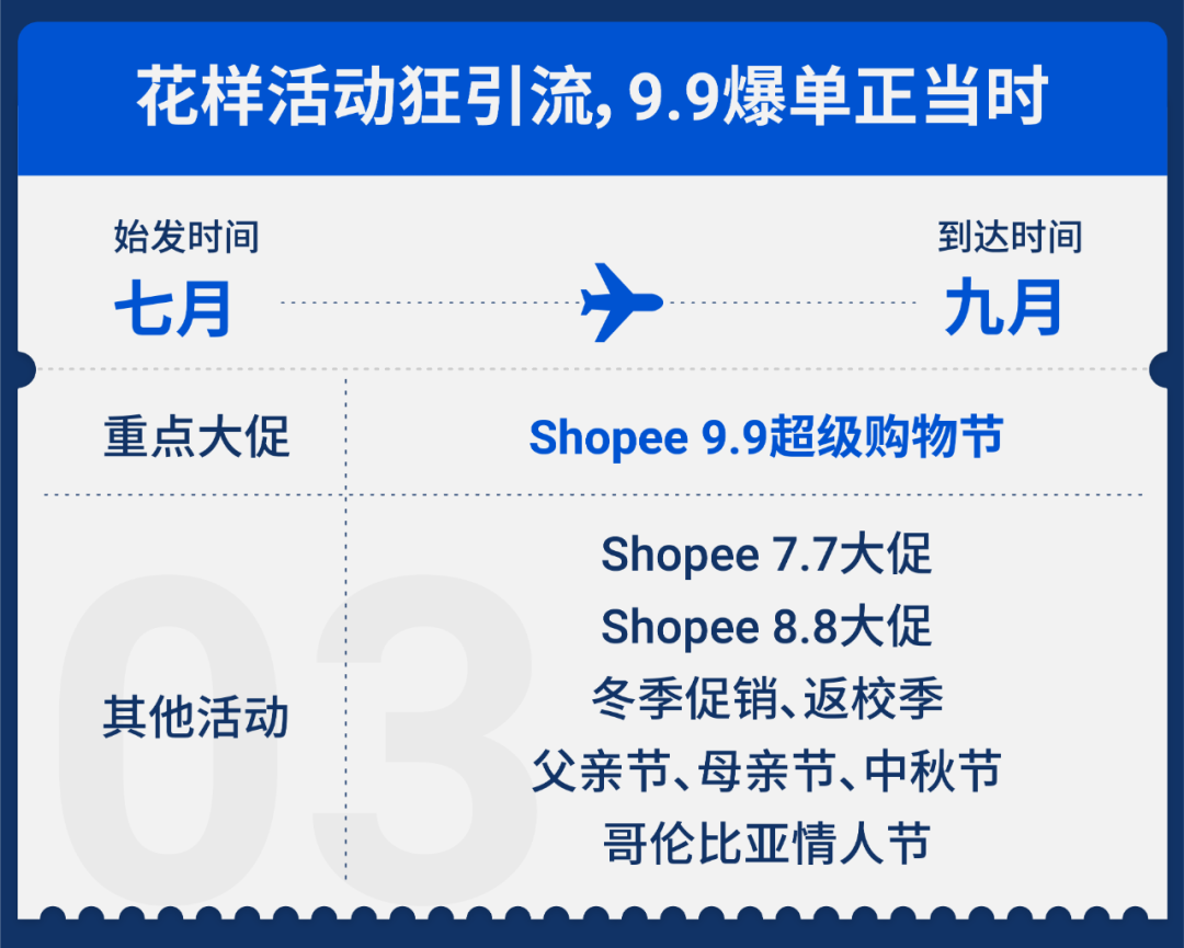 掘金号航班的第三站紧接着就迎来下半年旺季首场超级大促:Shopee 9.9超级购物节。7月和8月还有新市场巴西、哥伦比亚和智利的冬季促销,以及巴西和墨西哥的返校季等促销活动。流量加持推动9月筑起单量高峰,全品类疯狂吸金,嗨购全场!