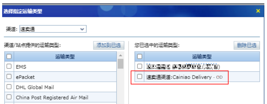 2、线路升级后,使用官方配物流服务的商家需要注意检查ERP设置,官方配订单运输类型请修改设置为:Cainiao Delivery-OD ,如下图(不同ERP页面展示可能有差异)