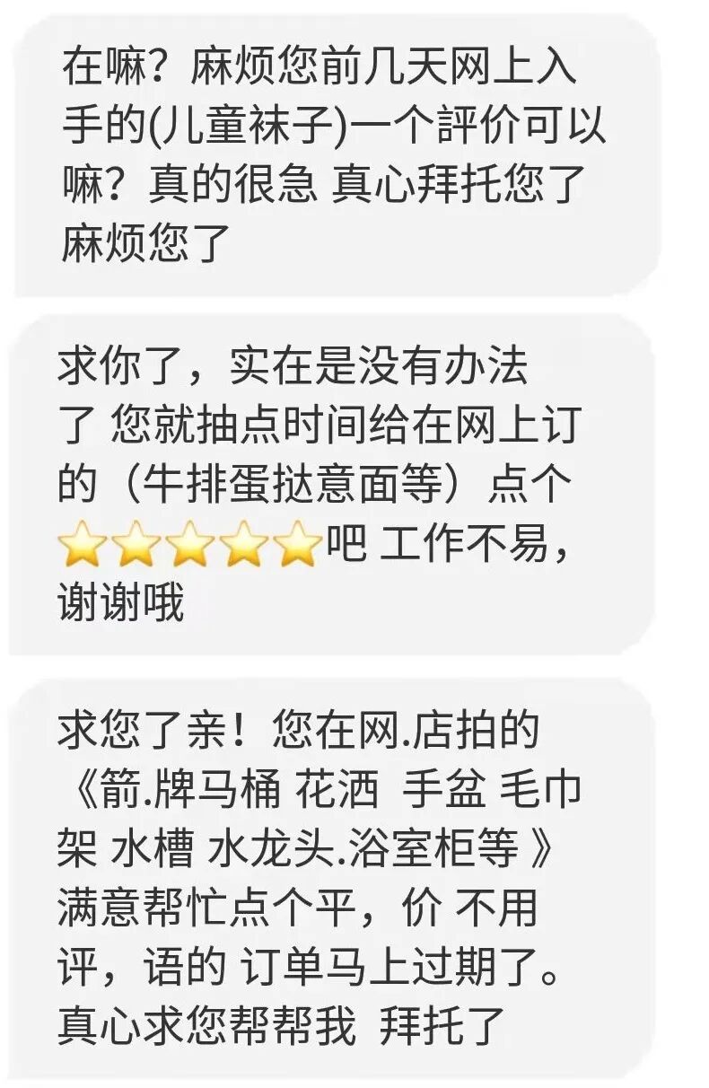 大家看一下这个小卡片,开头就是大字“我们需要你得帮助!”,扫一眼大概内容就是“我们有一个小女儿患了重病,我们急需您帮忙留个评论才好挣更多钱给孩子治病。”这画风,妥妥让我想起了每年双十一或618之后,因为没有评论吃不起饭过不下去的淘宝卖家们,给我发来的催评短信。