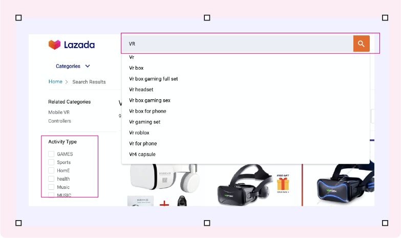 搜索平台流量关键词也有“捷径”可循,全量商家可以在Lazada商城前台的检索栏找词,排序靠前的都是当前该站点的热搜词汇,此外商家也可以在商城前台左侧的筛选栏查找属性词,修饰词。