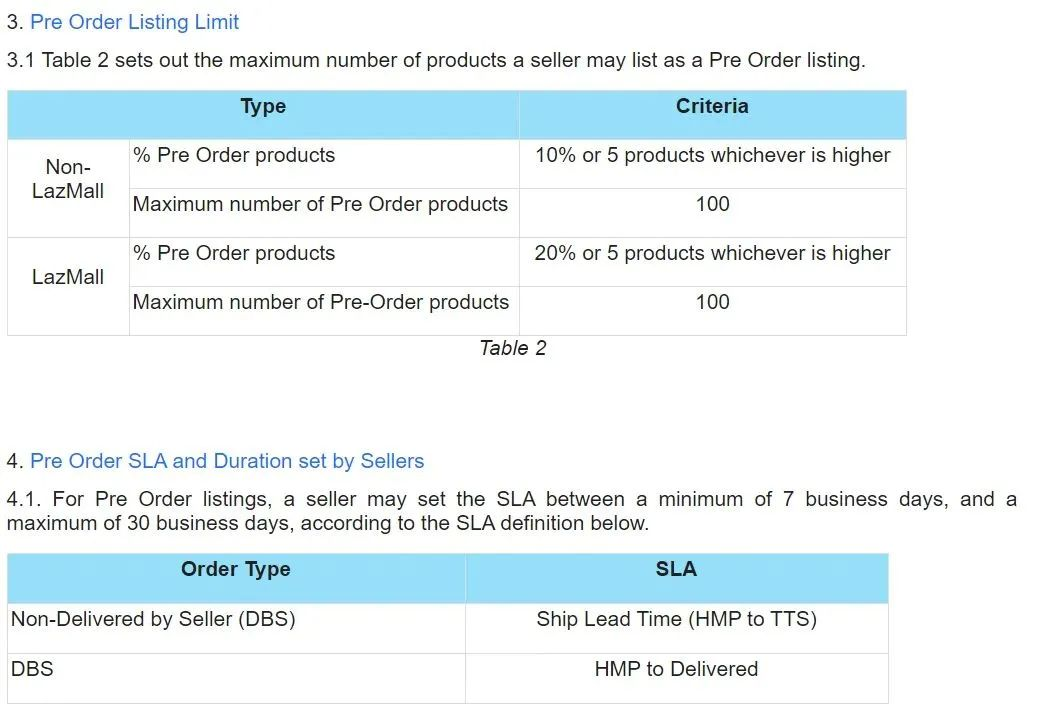 根据公告显示,LazMall 商家预售产品比例为20%,非 LazMall 商家预售产品比例为 10%,最高不超过 100 个商品;此外,对于预售商品,卖家可以将 SLA 设置在最少 7 个工作日到最多 30 个工作日之间。