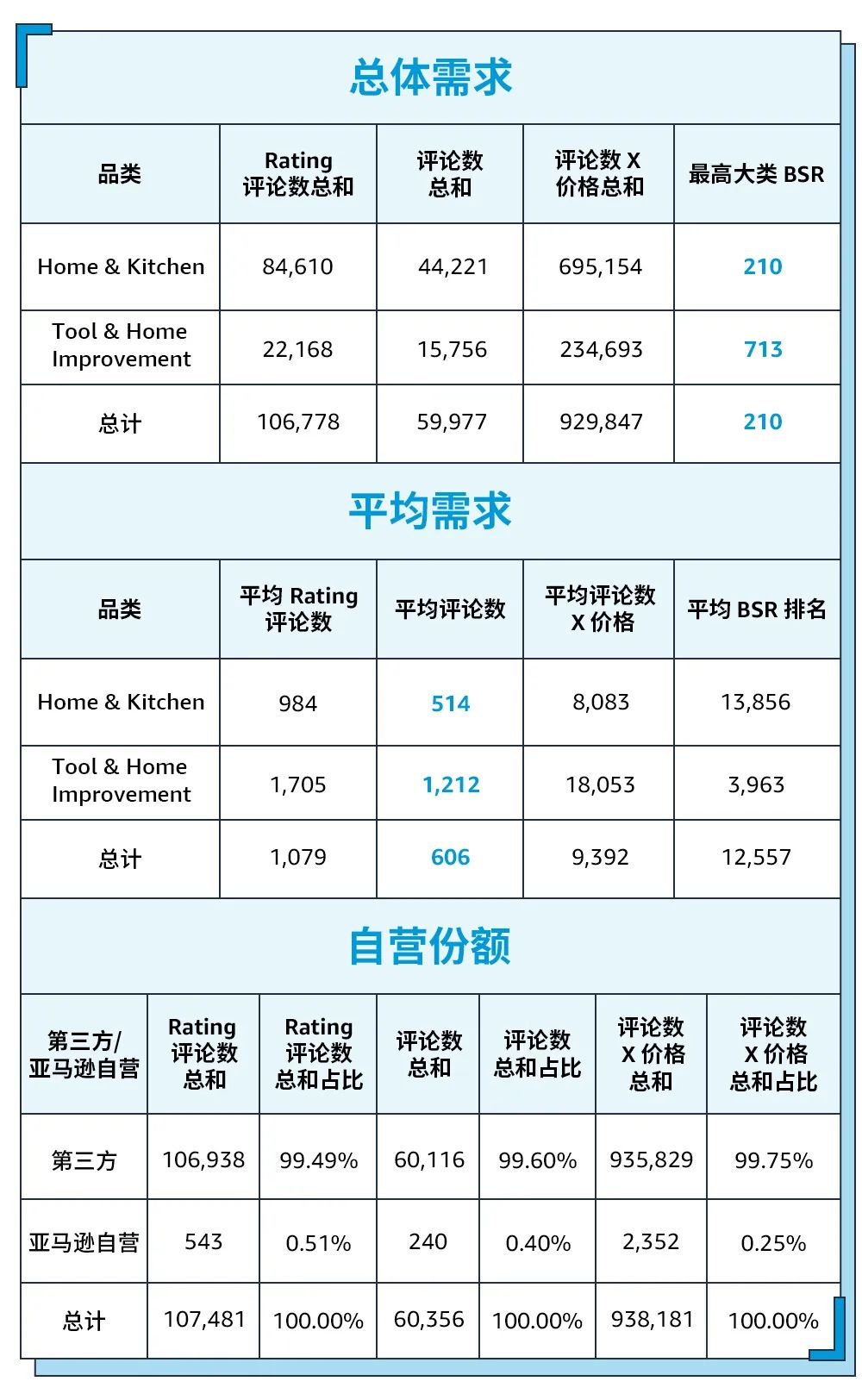 总体需求:在 Home & Kitchen 大类排名为第210名,Tools & Home Improvement 中排名713,都排在大类前1000名,市场空间较大;