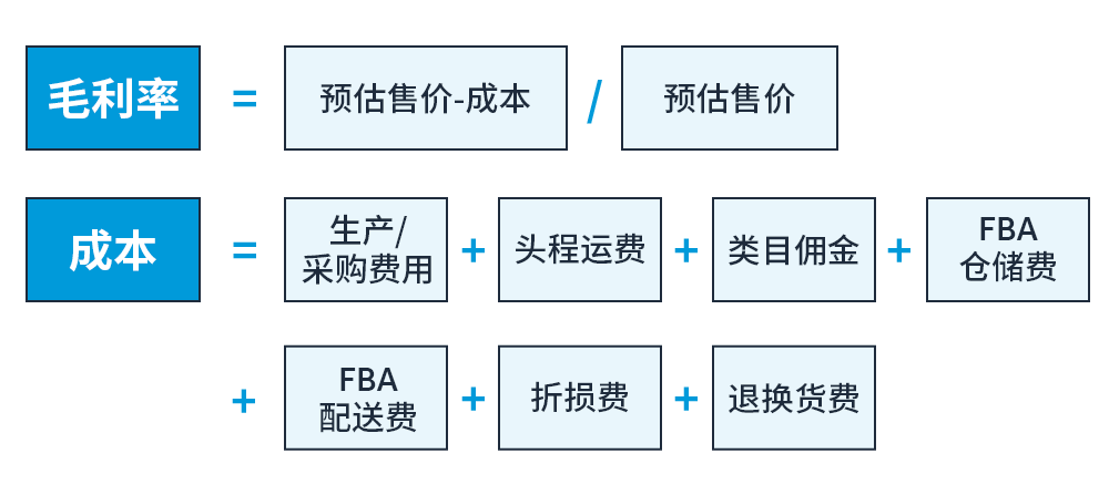 了解到竞品的基本利润数据,下一步就可以评估商品的毛利率了,即除去营销、推广成本之外,卖一单能赚的百分比。您可以根据以下公式预测一下自己的毛利率: