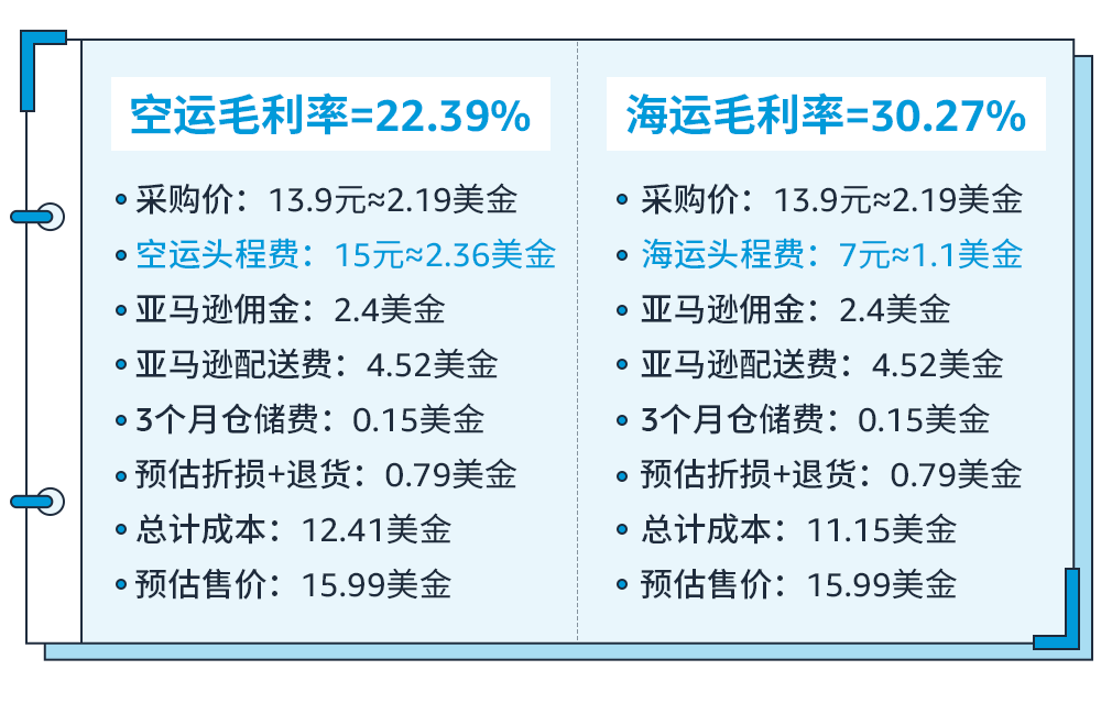 根据以下数据,可以看到空运水杯的单个利润为(22.39%x15.99=3.58美金),海运水杯的单个利润为(22.39%x15.99=4.84美金)。除此之外还需要做广告推广,假设广告 CPC 为1美金,小爱需要4次点击出一单,也就是广告转化率达到25%才能保证盈亏平衡。如果5次点击才出一单,那小爱卖一单就亏了。但对新卖家来说,25%的转化率还是很不容易达到的。