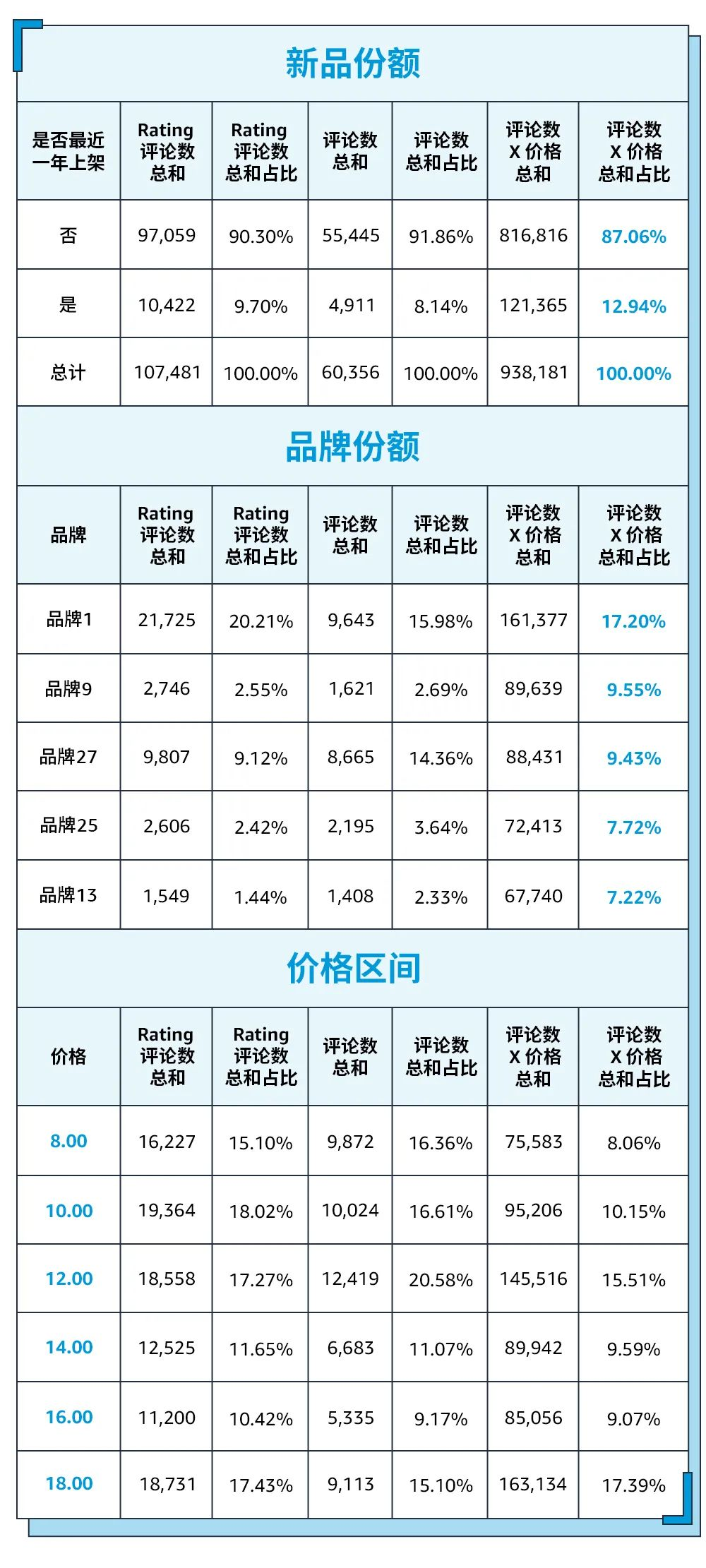 这些数据是从前台 ASIN 的13项数据中抓取,精准分析,得出表格数据,如果在分析过程中,卖家发现有明显的品牌垄断或者新品占比过低,说明面临激烈竞争、优势不明显。