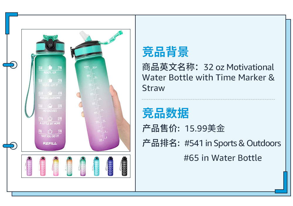 评估一款商品的毛利率,首先要找到一件竞品进行数据对标。如下图所示,这款竞品在亚马逊美国站的大类“Sports & Outdoors”中排名在541名,小类“Water bottles”中排名在65名。在大类排名中如果达到前1000名,都可被视为需求量较大的热销商品。