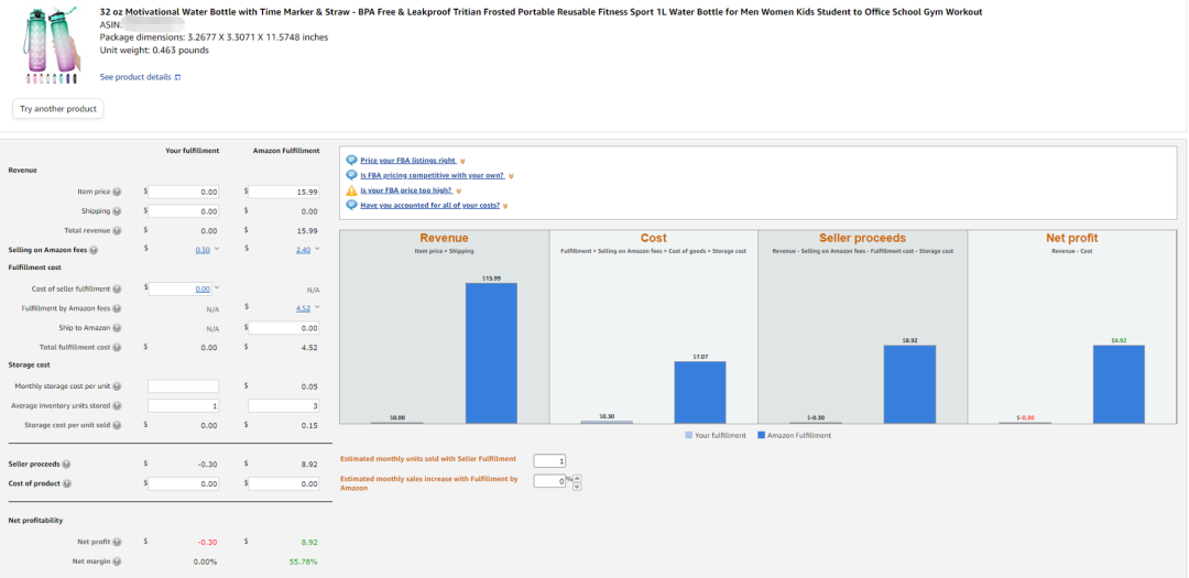 接下来需要通过竞品的销售佣金、配送价格以及3个月仓储费来计算竞品利润数据。从图中我们可以看出,配送费占了将近三分之一的商品售价,因为在亚马逊上售卖水杯是需要包装盒的,在商品到达亚马逊仓库后,测量重量时会通过比较商品重量和体积重量,选择较大的一方进行计算。在这里,根据包装尺寸得出来的配送费就是4.52美金。再加上销售佣金和3个月仓储费,其实并没有预想的高利润。