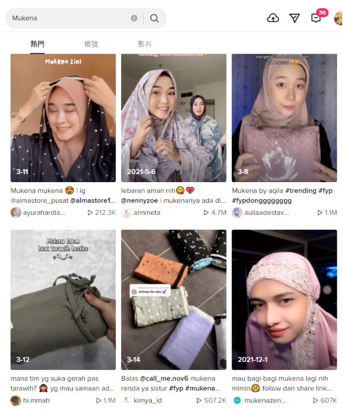 在TikTok上搜索穆斯林服饰Mukena,可以看到,3-8和3-12发布的视频,获得了100万的播放。