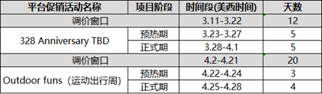 2022年3-4月平台大促时间节奏如下(具体大促时间请关注平台公告,调价窗口仅针对报名大促的商品,未报名大促商品仍旧不受大促锁价限制)