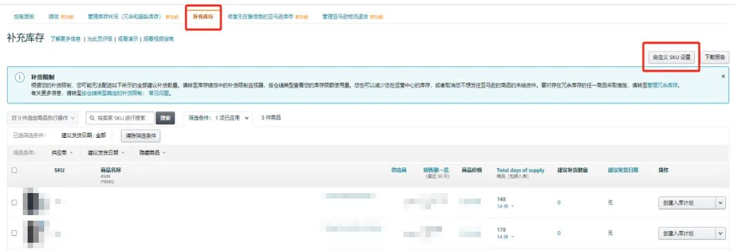 亚马逊建议各位卖家在发/补货时,可在卖家平台的“补充库存”页面,确认需补货的畅销产品,通过“自定SKU设置”来完善供应商交期、备货时间、补货频率、供应链等信息,使计算结果更加精准!