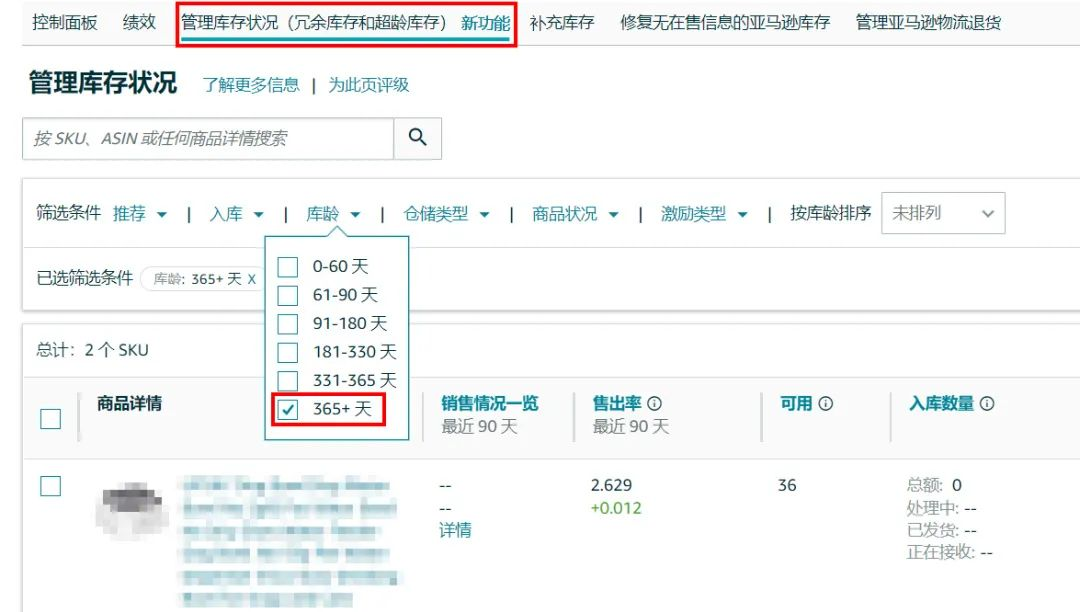 这是一个在短期内快速提高IPI分数的方法。卖家登陆卖家平台,访问卖家平台的库存>库存规划>管理库存状况页面,筛选出库龄超过365天的商品,这些商品会产生长期仓储费,减少此类商品不仅有助于提高IPI分数,也可帮助降低仓储费。