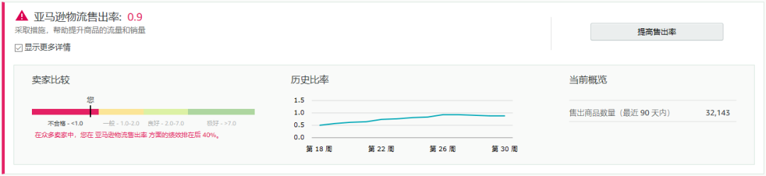 卖家可以访问库存绩效控制面板,找到您的“亚马逊物流售出率”。如果您的售出率<2或属于“一般”等级(点击“显示更多详情”查看),建议您至少努力达到良好等级,从而帮助提高您的IPI分数。