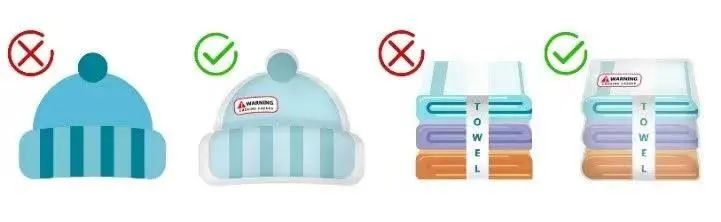 ✔纺织品需密封塑料袋,并有窒息警告标签。