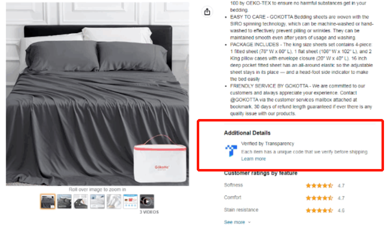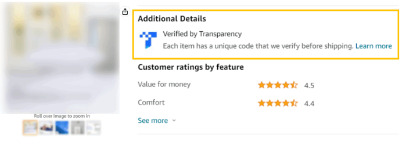 以前加入亚马逊透明计划的卖家,在其商品详情页是看不到任何标志的,此次升级后将会在listing五点描述下方的“更多信息”部分看到蓝色的“T”标志,让消费者第一时间知道,该商品已受Transparency保护。