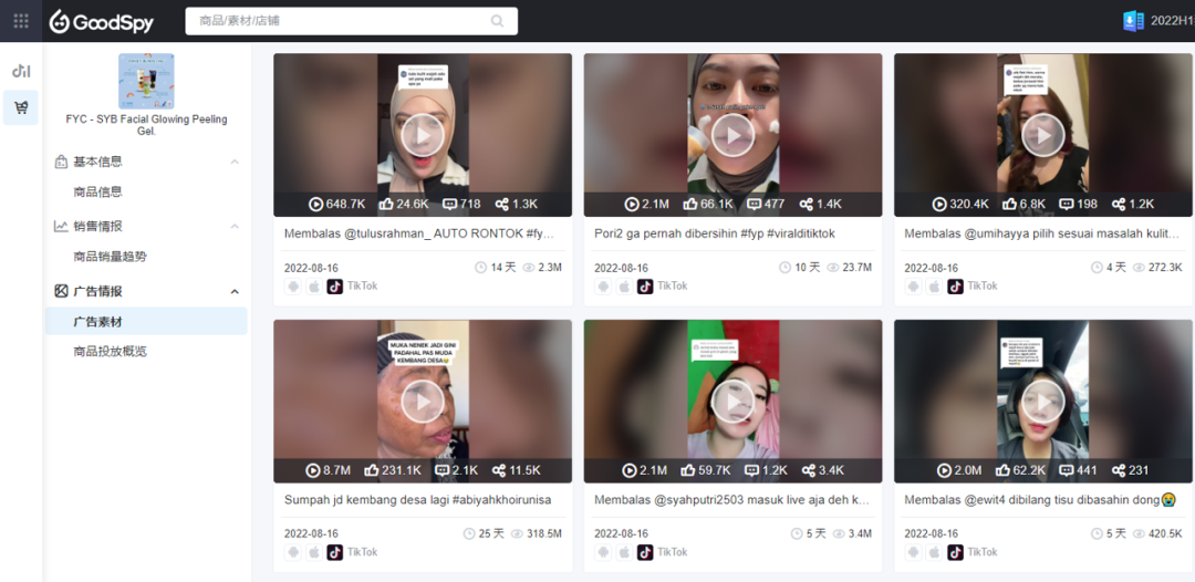 除了社媒运营外,该款产品还有在 TikTok 上持续投放广告,据 GoodSpy 显示,SYB Facial Glowing Peeling Gel 从7月份开始投放,8月份投放力度加大,平均每日发现广告投放数在30条左右,整体广告曝光量及曝光转化效果明显。