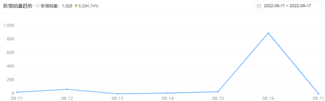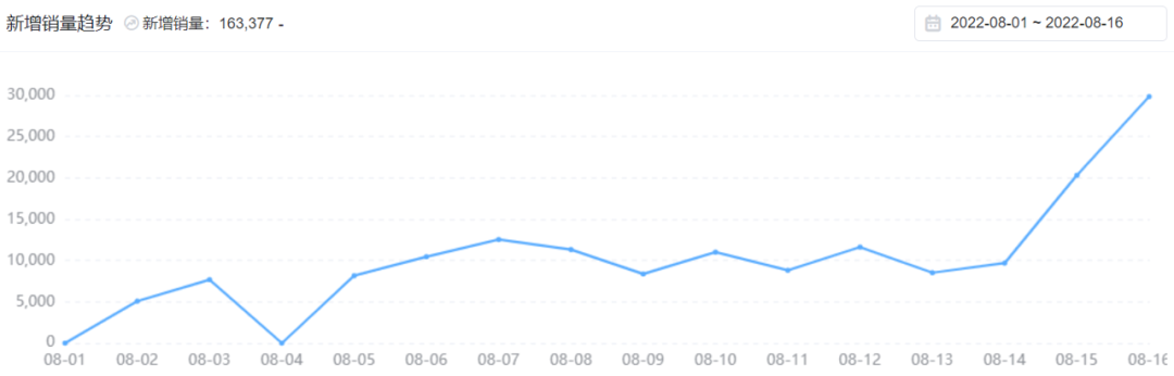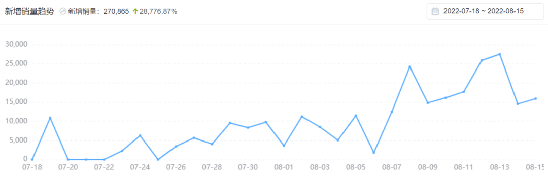 由@SYB 推出的面部清洁凝胶 SYB Facial Glowing Peeling Gel 近七天新增销量11万+,近30天累计新增销量27万+,环比增长2,239.93%。据 GoodSpy 显示,该款产品上架于4月6日,单价约为1.18 ~ 4.02美元,产品目前销量呈上升趋势,有较大的增长潜力。