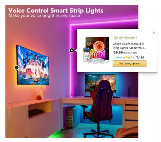 使用可购物图片,您可以选择将图片中的任何产品设为可购物,使客户能够点击产品并查看基本信息,例如名称、价格、客户评分、Prime 可用性等。