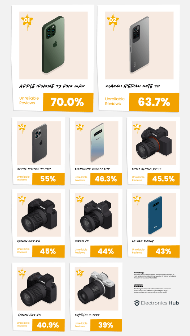 此外,Electronics Hub的研究数据显示,亚马逊上所有电子产品评论中,智能手机与相机获得虚假评论的占比最高。虚假评论密度最高的产品是iPhone 13 Pro Max;不可靠评论整体密度最高的品牌是小米;所有游戏机中虚假评论占比最高的是Nintendo Switch,大约有36.3%;而相机中,索尼Alpha 7R IV ( 45.5% ) 和佳能 EOS R6 ( 45.0% ) 是用户评价最不可靠的。