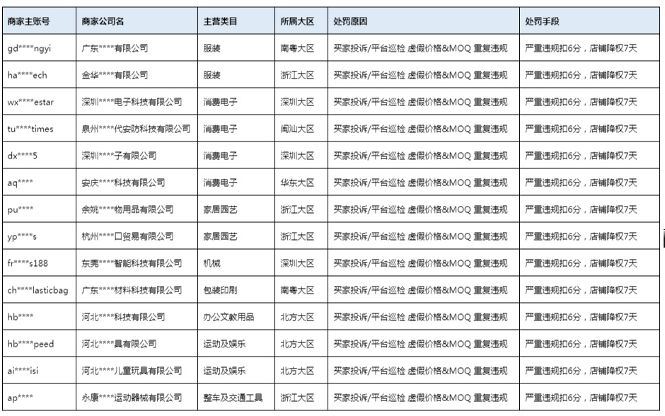 公告显示,10月扣分处罚商家处罚原因:买家投诉/平台巡检,虚假价格&MOQ,重复违规。处罚手段:严重违规扣6分,店铺降权7天。