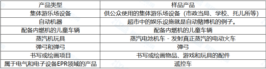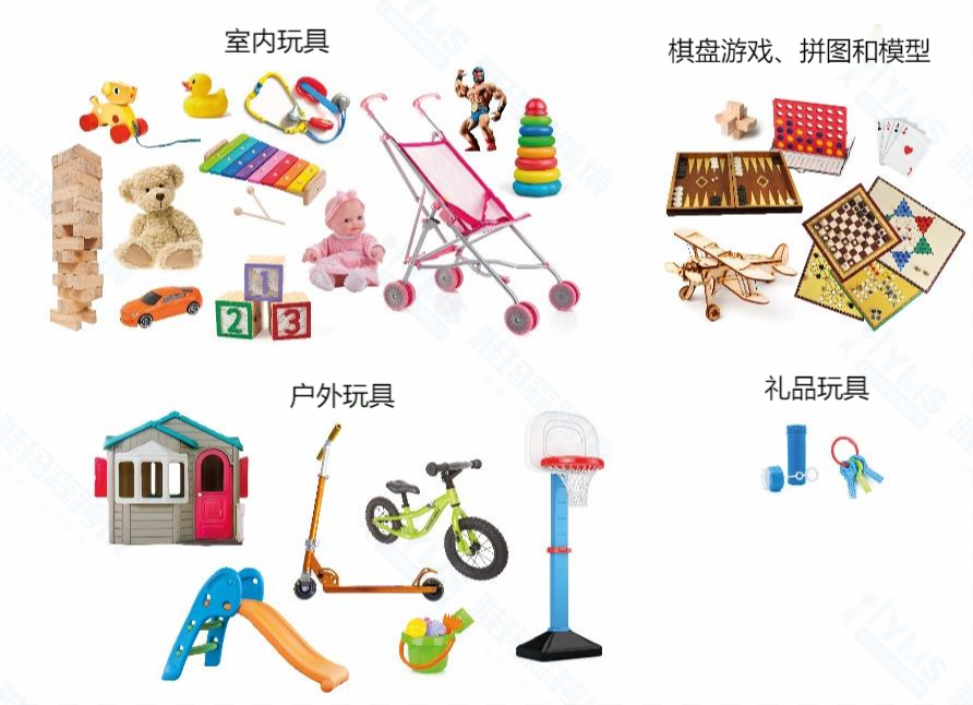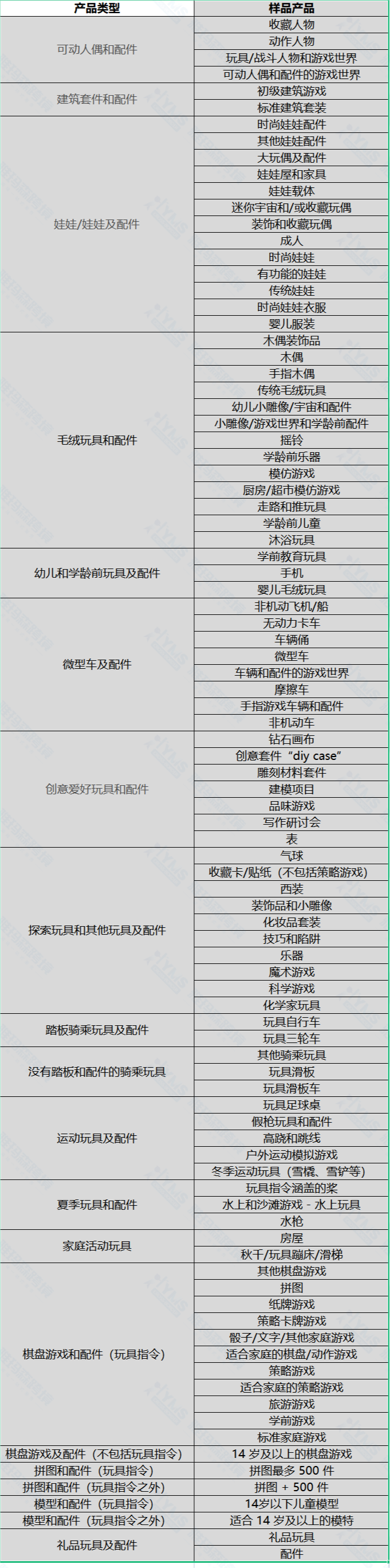1、室内玩具:小雕像、洋娃娃、毛绒玩具、幼儿玩具、微型车辆、建筑和探索游戏等; 2、棋盘游戏、拼图和模型; 3、户外玩具:随身玩具、运动玩具、夏季玩具、设备、游乐场玩具等; 4、礼品玩具。 玩具包含的产品:(非详尽清单) 被排除在外的玩具的产品:(非详尽清单) 以上清单为官方网站直译,可能存在差异,具体以官方为准。