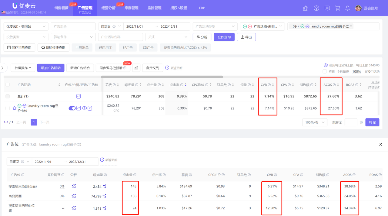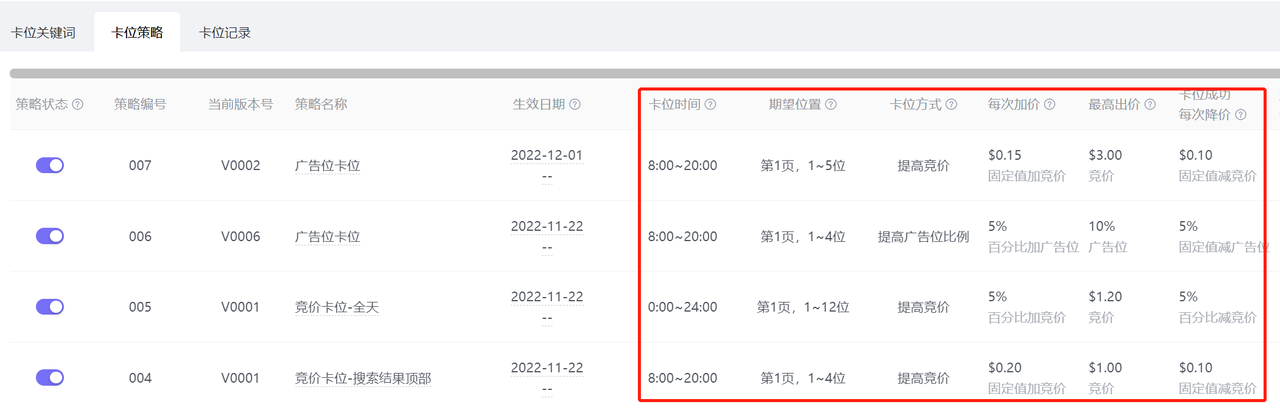 卡位的策略配置方式,可以通过调整竞价、调整广告位,因此查看广告关键词的整体表现效果,以及对应广告位的表现效果,决定使用哪种方式。
