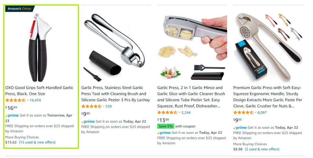 有些搜索结果排名较后的位置也会出现Amazon's Choice商品,但即使如此,一个醒目的徽标也会吸引消费者点击,通常带有Amazon's Choice徽章的商品点击率都要比其它商品要高很多。