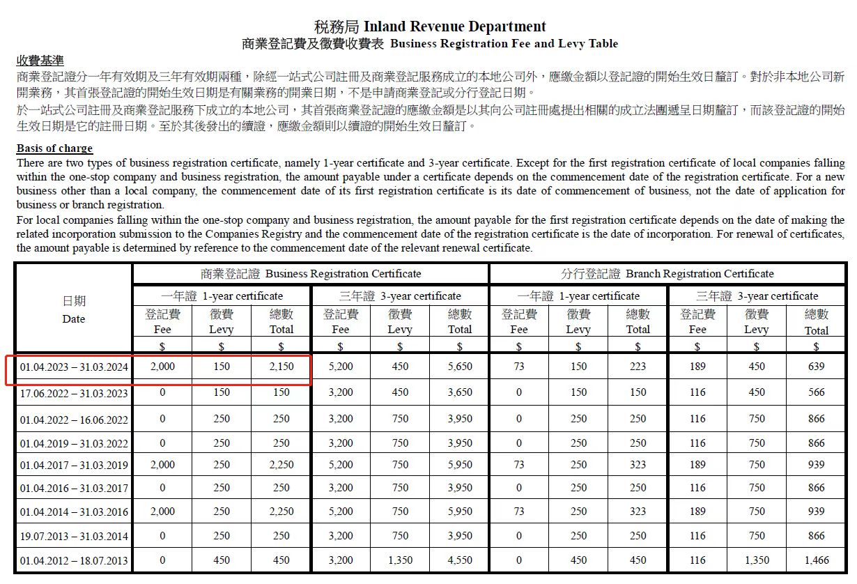 2月22日香港政府刚刚公布完“2023-24香港财政预算案”,2月23日,香港税务局官网就更新了最新的“商业登记证收费表”。