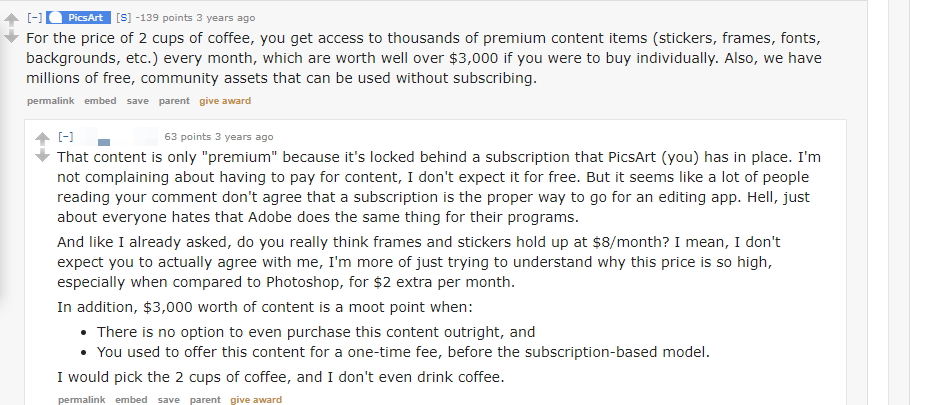 有关价格的问题,Picsart的团队基本上用了很官方的语言来回。结果,不出所料,反应也不太好。