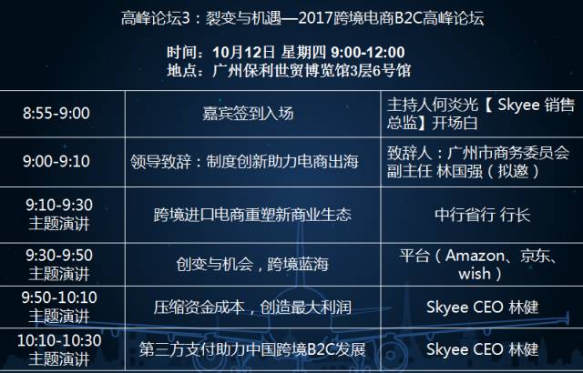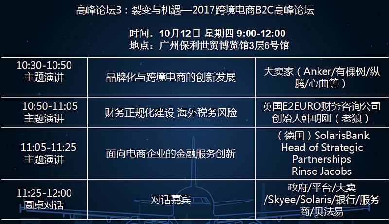 在2016年“以会带展”成功的基础上,本届展会更加注重于“以展促会、展会互融”,跨境电商生态圈知名商业领袖参与的领袖峰会与高峰论坛,及三大世界级知名跨境电商平台对接会将为展会带来数以万计的专业观众和实实在在的业务机会。我们的主题和主讲嘉宾都已确定的,分别有: