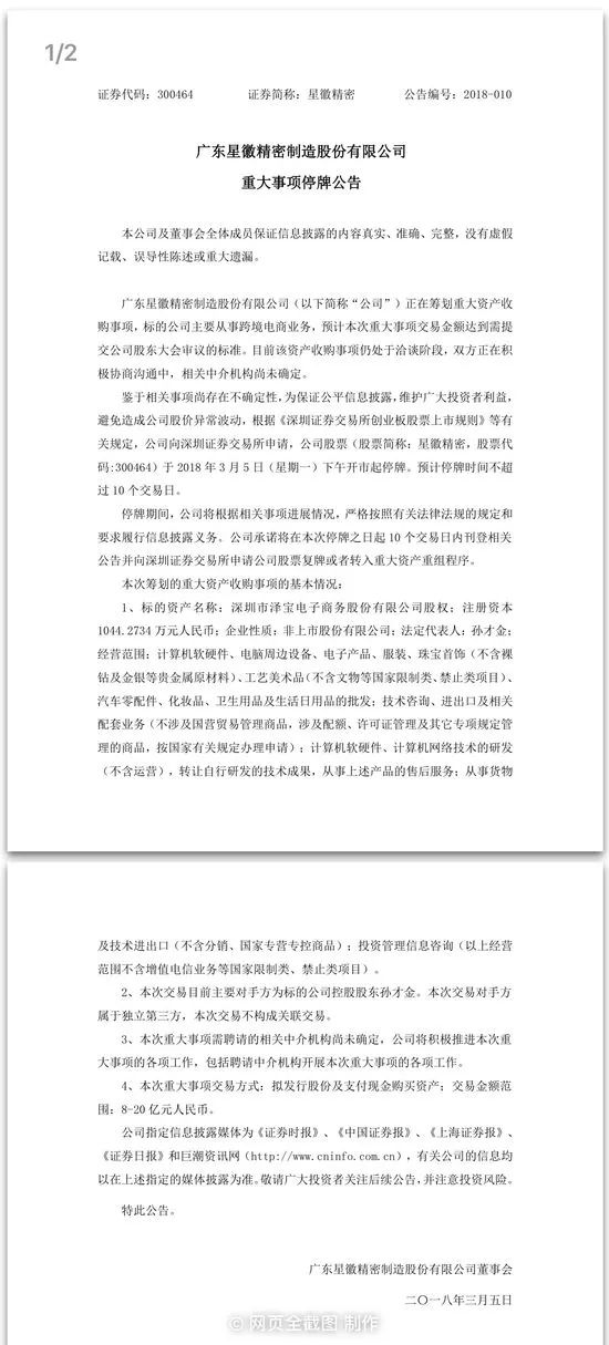 广东星徽精密制造股份有限公司(以下简称“星徽精密”)发布重大事项停牌公告,公告显示,星徽精密正在筹划重大资产收购事项,拟以发行股份及支付现金的方式购买深圳市泽宝电子商务股份有限公司股权,交易金额范围为8亿元-20亿元。目前该资产收购事项仍处于洽谈阶段,双方正在积极协商沟通中。
