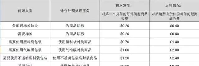 e、计划外服务费:若遇突发情况,需要亚马逊代为处理的,则需要收取相应的额外服务费。(譬如:你寄到亚马逊仓库的商品没有经过妥善的预处理或贴标等)按件收取,第一个货件享半折优惠。