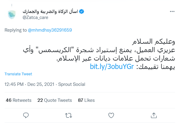 而沙特天课、税收和海关官方帐户回应其中一名询问此事的推特用户时表示,目前沙特仍然是禁止进口“圣诞树”和任何带有伊斯兰教以外宗教标志的标志,如发现会没收。