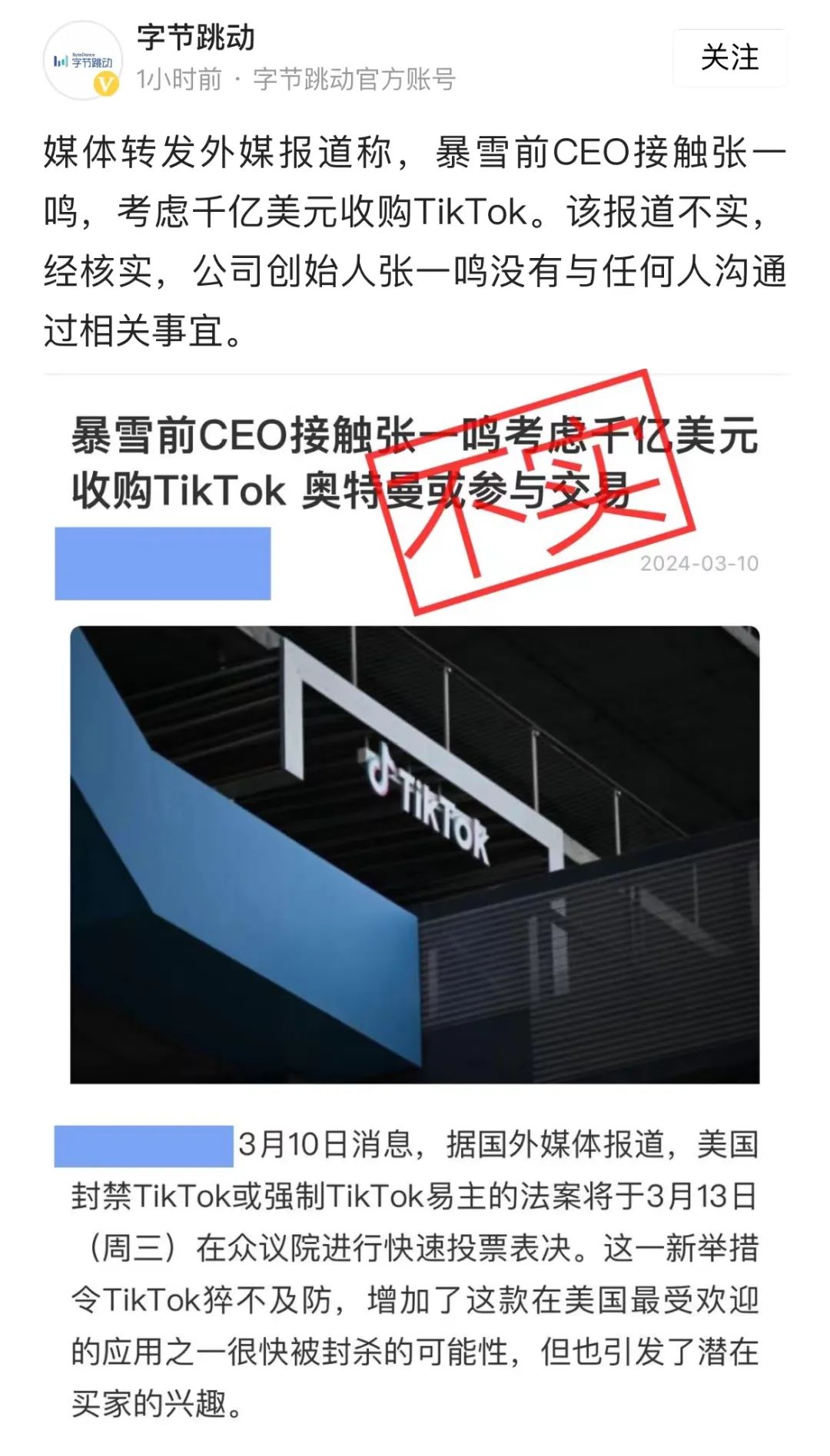 3月10日,字节跳动在今日头条官方账号表示,媒体转发外媒报道称,暴雪前CEO接触张一鸣,考虑千亿美元收购TikTok。该报道不实,经核实,公司创始人张一鸣没有与任何人沟通过相关事宜。