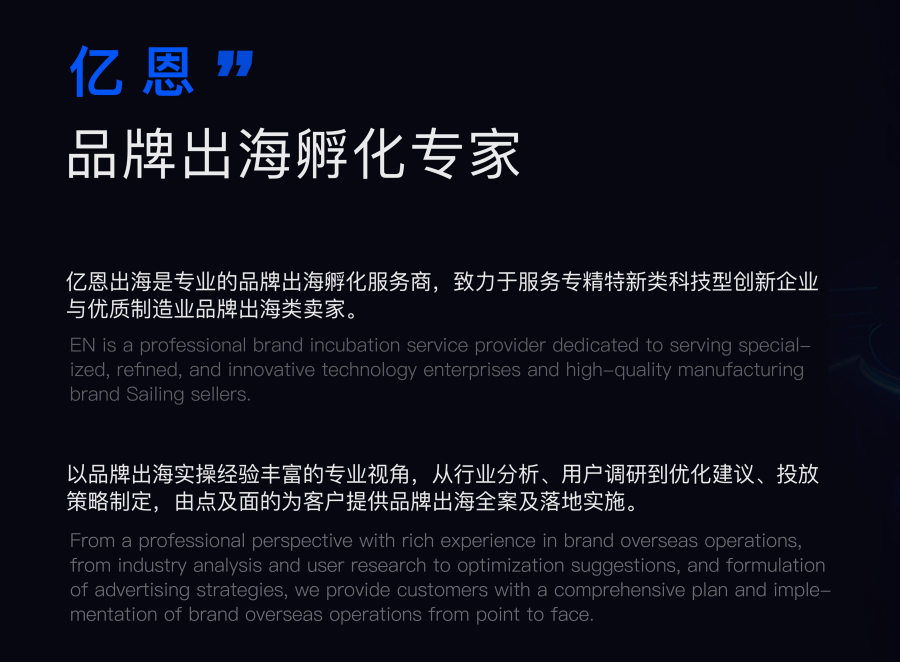 亿恩核心团队都是经过跨境电商市场论证超十年的专家,能够拔除企业出海市场分析不专业、运营体系不完善、品牌定位不精准的痛点,从行业分析、用户调研到优化建议、投放策略制定,为企业量身定制品牌出海全案并落地实施,支持企业谋求全球化布局。