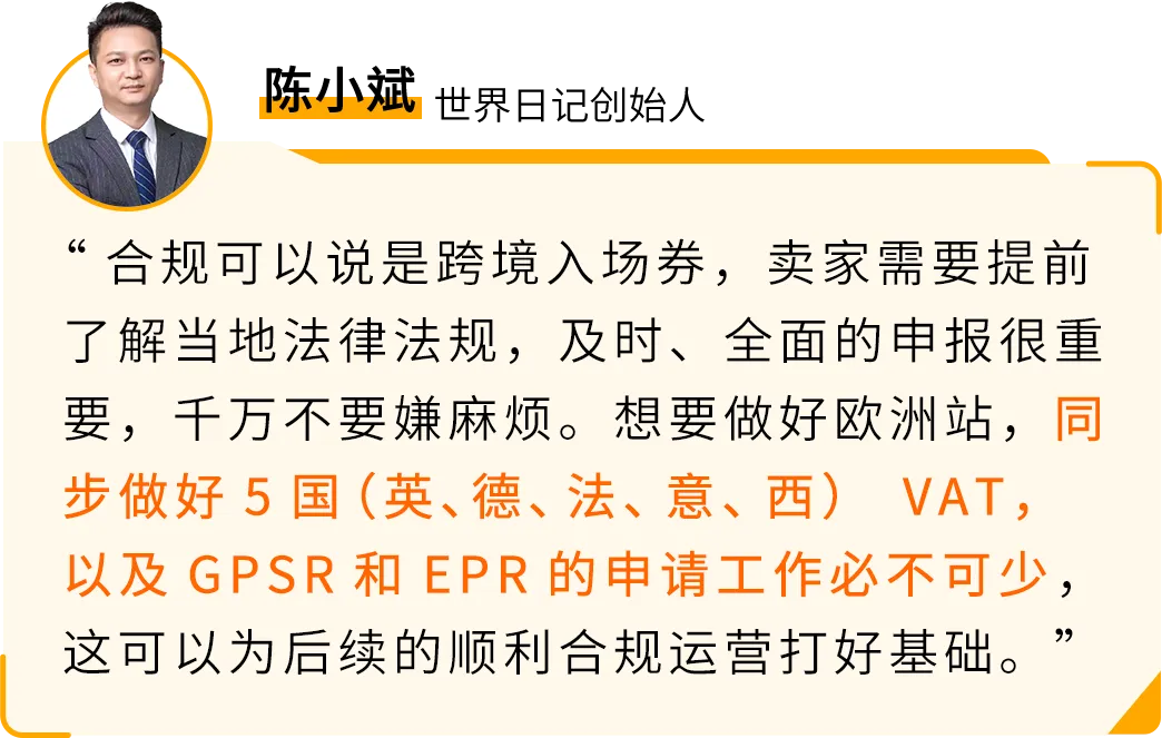 合规方面,应尽早完成英、德、法、意、西VAT+GPSR+EPR的申请工作,并同步开启荷、瑞、波、比、爱GPSR+EPR的相关准备,避免影响后续的合规运营;