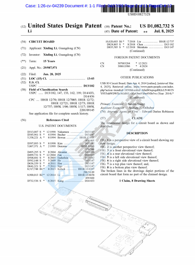 2026 年 4 月 17 日,DI LI LAW, P.C. 代理中国广东权利人Xiuling Li 发起美国外观专利侵权诉讼正式立案,主要聚焦儿童相机核心部件侵权维权。涉案专利号为D1082732,于2025年7月8日正式授权,保护电路板的外观设计,该电路板是儿童相机的核心内部组件,直接决定相机功能正常运行,是产品不可或缺的关键部件。