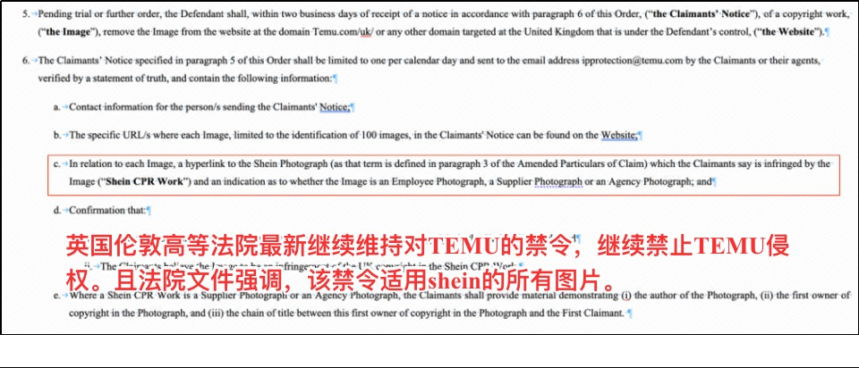 此外,上个月,针对Shein提起的上千张图片被侵权的诉讼,在经过最新庭审后,Shein也再次赢得英国法院临时禁令,最新禁令还明确了禁令适用的范围即Shein有权投诉的图片包括所有Shein的图片,不论是Shein自主拍摄的,还是供应商、摄影机构拍摄的Shein图片,Shein均能进行投诉,Temu需在收到投诉的两日内下架侵权图片。