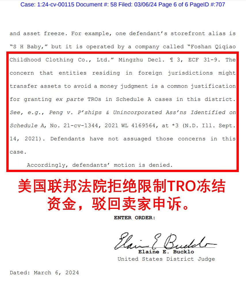 此外更早前的2023年12月至2024年1月期间,针对Shein自有品牌的维权,美国法院就已经接连发布过三个TRO临时限制令,要求涉侵权商家停止相关侵权Shein的行为,大部分卖家位于Temu平台上,涉侵权产品范围涉及女装、童装等范围极其广泛。期间有Temu卖家对TRO发起申诉,但美国法院全部驳回了这些卖家的申诉并维持冻结资金的决议,充分说明法院认为这些商户侵权行为的成立。