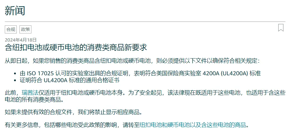 大家好,我是奶酪。 四月收尾,这个月除了亚马逊不少大卖的年报成为热点,亚马逊频繁调整FBA、佣金费也让不少卖家怨言颇深,这把推出的新规也不逞多让,让卖家直接炸锅。 近日,相信不少卖家收到了亚马逊的即时生效的新规定:如果您销售包含纽扣电池或纽扣电池的消费品,必须提供UL4200A证明并列出符合UL4200A的通用合规证书,如未能提供有效的合规文件,将移除相应的产品链接! 这个通知一出,炸出一大批卖家,毕竟纽扣电池和带有纽扣电池的产品可不少,什么计算器、钟表、照相机、钥匙扣、手电筒、音乐贺卡、假日装饰品、遥控器里面都有,甚至这一范围可能直接涉及一家店的所有产品。果不其然,规定一生效众多卖家就有反馈的产品都被标记了。 这把操作让不少卖家顿时陷入恐慌,突然出台的规定,即时生效,大批量产品直接被标记,还面临商品下架风险,但是没办法平台政策变动不断,卖家唯有以合规应万变,关于新合规,各位卖家要了解! 01 GCC证书 合规里提到的GCC证书,是指一般用途产品(非儿童产品)的制造商或进口商在适用消费品安全规则的情况下在书面文件中证明其产品符合这些适用规则的一份证书。GCC证书本质上是由制造商或进口商出具的一份自我声明,以证明该产品经过相关测试并符合相关的CPSC和ASTM安全标。 ANSI/UL4200A-2023是GCC发证的标准。 02 UL4200A 由于美国儿童误吞了纽扣电池,2023年9月,美国消费品安全委员会(CPSC)投票批准UL 4200A-2023作为含有纽扣电池的消费品的强制性消费品安全标准,同时编入16CFR part 1263。同样,如果消费类产品使用纽扣电池或硬币电池,则适用此标准更新通知。 UL4200A旨在评估含纽扣/硬币电池的消费品的使用风险,考虑在日常使用中有可能被儿童触及,摄入造成伤害的风险。UL 4200A 从结构、测试、警告标签(产品本体和包装)、说明书等多方面对含纽扣电池产品做了系统性的要求。 此外,只要包含纽扣电池的产品出口到美国就需要满足UL 4200A的相关要求,无论纽扣电池是否可以更换,无论纽扣电池是否可以充电。 03 1.包含可更换纽扣电池或硬币电池的电池仓必须固定,使得它们需要使用工具或至少两个独立且同时的手部动作才能打开。 2.纽扣电池或硬币电池的电池仓不得允许此类电池因正常使用和滥用测试而被触及或脱出。 3. 整个产品的包装必须带有警告。 04 要做什么动作 建议卖家们如收到相关通知,需要尽快行动,确保在规定时间内完成所有合规性要求,以保障产品的正常销售。 对于含有纽扣电池的产品,卖家需准备并提交以下文件: 1、GCC证书,这是证明产品已通过UL 4200A标准测试的必备声明文件 2、产品包装图需带有条形码,并明显标注关于危险误食的警告标识,以确保消费者的安全 3、提供一份符合ISO17025标准的UL 4200A实验测试报告,报告中应包含商品图片,以证明受检商品与商品详情页面上发布的商品相同。卖家可选择委托相关机构完成这些测试报告的编制 若产品不含有纽扣电池: 1、仔细检查Listing中的描述,删除或修改可能引发误解的敏感词汇 2、提交申诉。在申诉中明确声明产品的用途、材料,并强调已明确告知消费者产品不含纽扣电池。在此情况下,通常无需提供额外的文件证明,申诉一般能够得到通过 05 如何提交合规性文件 ①在【绩效】选项卡,选择【账户状况】。 ②在右下角的【管理您的合规性】下,点击【商品合规性请求】。 ③提供文件,点击【提供文件】;或者要申诉,点击【申诉请求】,并从下拉菜单中选择相应的【申诉原因】。 ④上传文件,请拖放文件,或者打开浏览窗口选择文件。 ⑤点击【提交】,发送您提交的内容供亚马逊审核。 那么今天的分享就到这里,祝各位卖家朋友们大卖,我们下期再见!