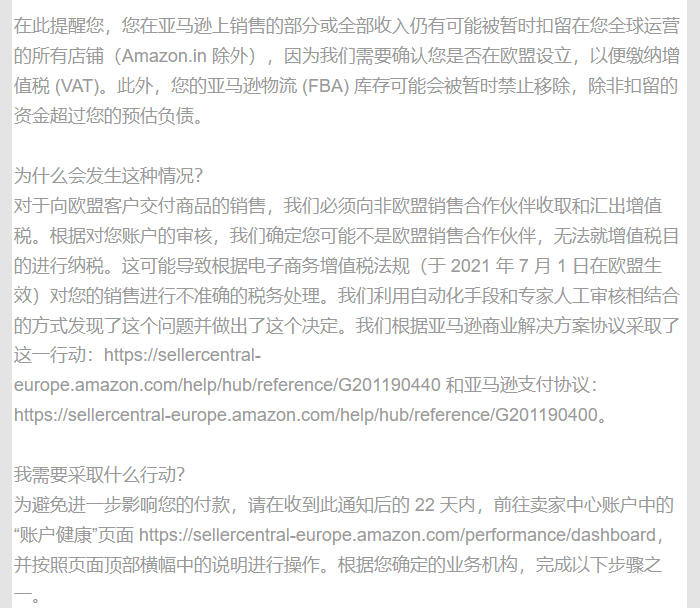 根据亚马逊官方给卖家发送的邮件显示:如果企业不是欧洲本土公司,这可能导致根据电子商务增值税法规(于 2021年7月1日在欧盟生效)对卖家的销售进行不准确的税务处理。为避免进一步影响卖家的付款,