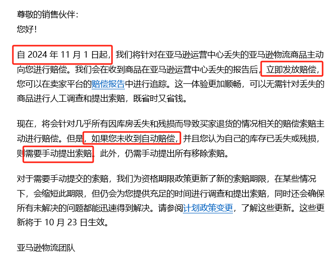 从2024年11月1号起,由亚马逊FBA配送的商品,如果出现在亚马逊运营中心丢失的情况,亚马逊将在收到丢失报告后立即发放赔偿,而不需要再手动提交索赔了。