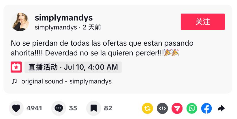 更重要的是,她遇到了TikTok,这是Mandys职业生涯的转折点。TikTok成为了一个重要的展示平台。她在TikTok上使用西班牙语创作视频内容和直播,成为美区西语人群一个标杆达人。