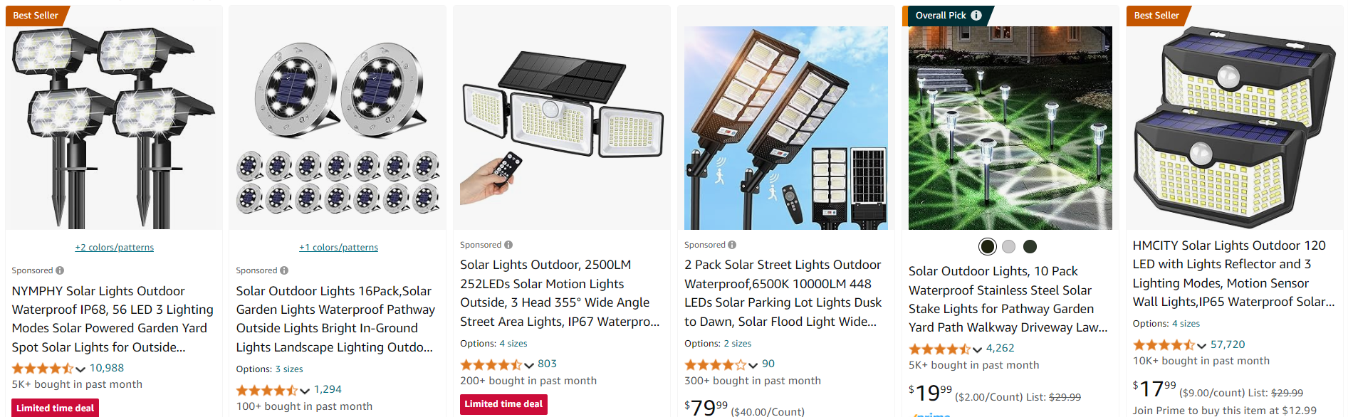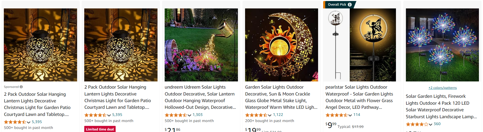 除了照明,借用灯光装饰花园或庭院装饰也是老外的一大需求,亚马逊上在售的相关Listing多达20000+少,留评过百破千的产品不在少数。