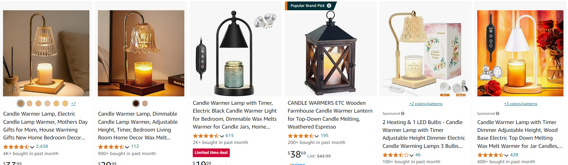 融蜡灯通过灯泡加热蜡烛,使其融化并释放香气,不仅安全环保,而且精致的外观还能起到装饰作用,俘获大批消费者的芳心。亚马逊上在售的相关listing达1000+,月销过百甚至是破千的产品不在少数。