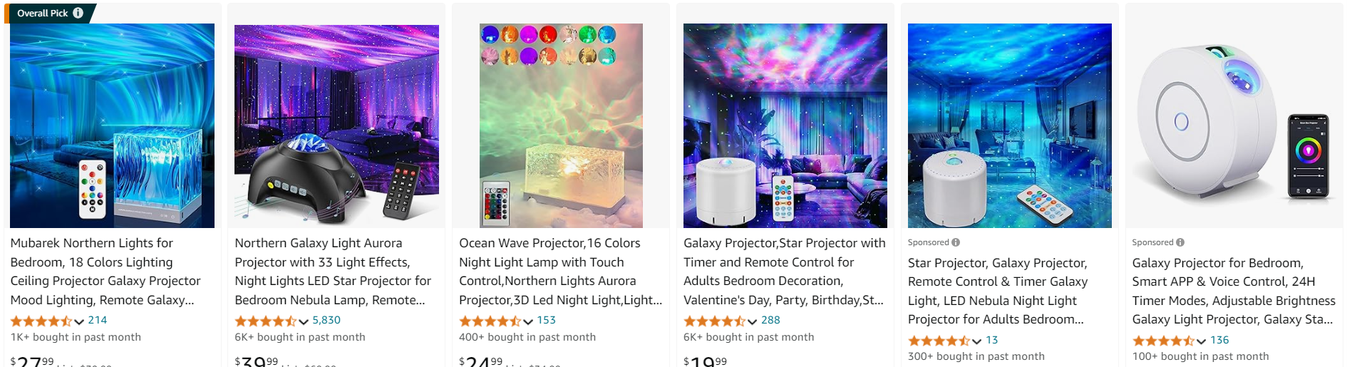 要说营造氛围感,投影灯绝对是最佳选择,自用或者用来送礼都很适合,销量自然不会差,亚马逊上留评月销双双过千的产品非常多。