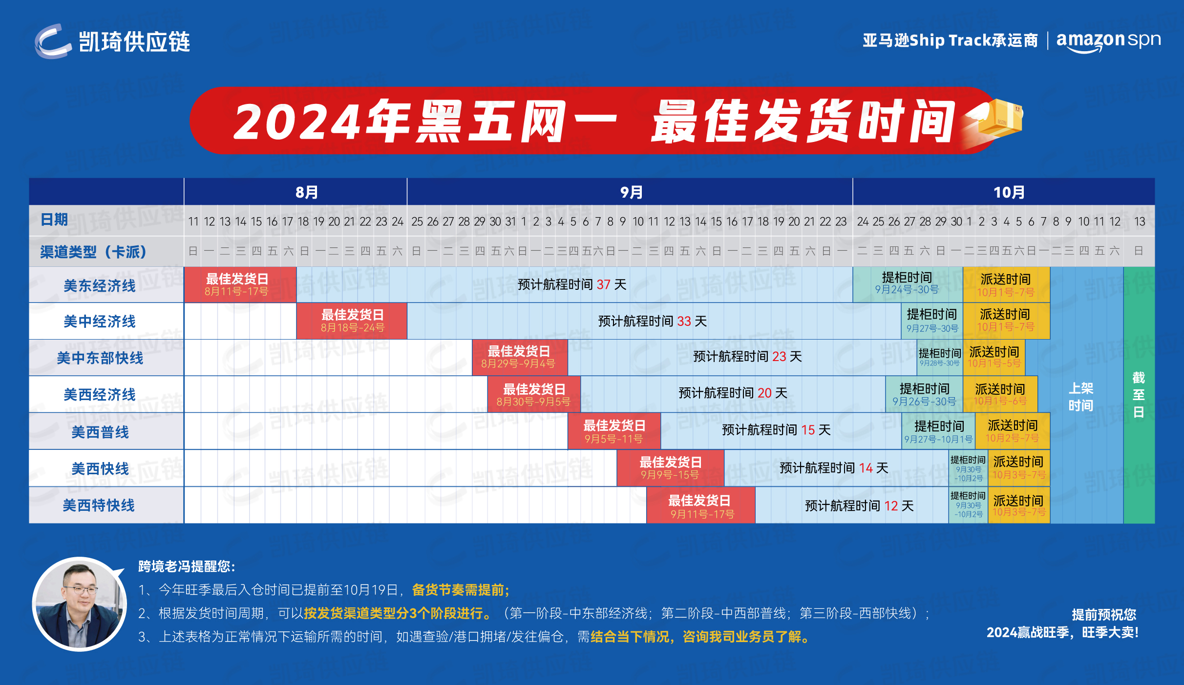老冯建议:根据不同的海运渠道速度,可以分为经济线、普船、快船和特快船四种类型。例如,对于美中东部路线,选择普船发货需要20天以上的航程时间,因此9月的第一周是最佳发货时段;而对于航程时间最短的美西特快线路,仅需11-12天的航程,故9月中旬发货也可及时赶上黑五网一的入仓时间。