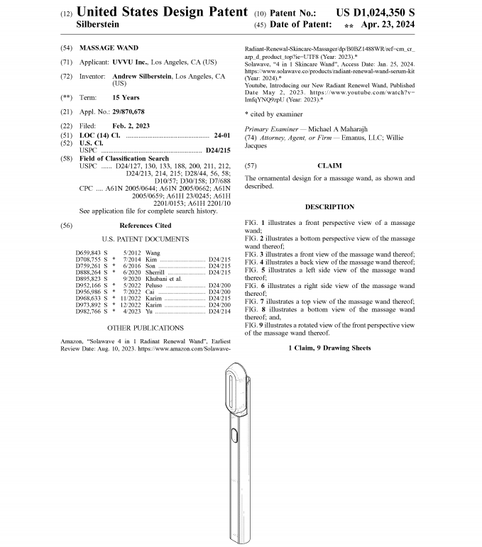此次发案主要为旗下一款面部按摩棒维权,专利名称Massage wand,专利号USD1024350S,2023年2月2日提交申请,2024年4月23日下证: