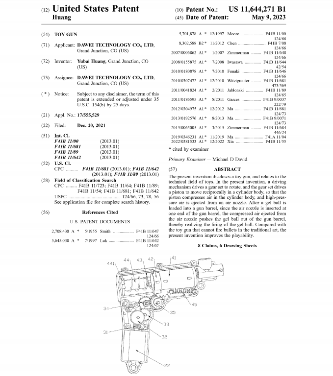 涉及名为TOY GUN的美国发明专利,专利号US11644271B1,2021年12月20日提交申请,2023年5月9日下证: