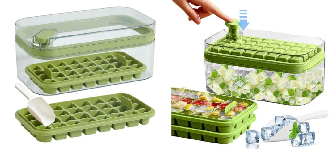 涉案产品是一款硅胶冰托盘模具套件,包含盖子、容器、冰勺、冰托盘模具和压板。使用压板可一次释放24块冰块,然后倒入冰桶中方便取冰。