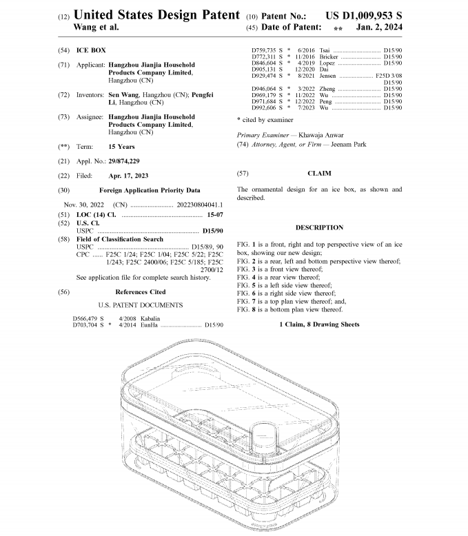 涉及名为ICE BOX的美国外观专利,专利号USD1009953S,2023年4月17日提交申请,2024年1月2日下证: